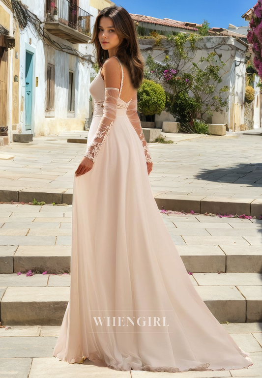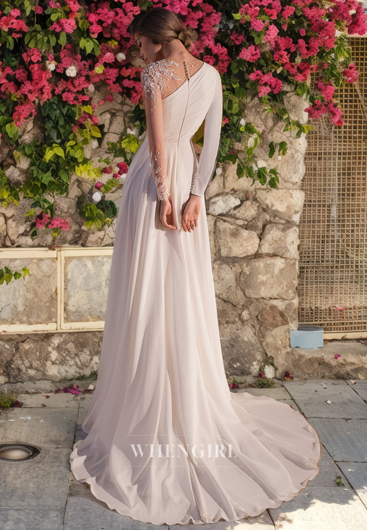 A-Line V Neck Long Sleeves Pleated Chiffon Wedding Dress with Train and Slit