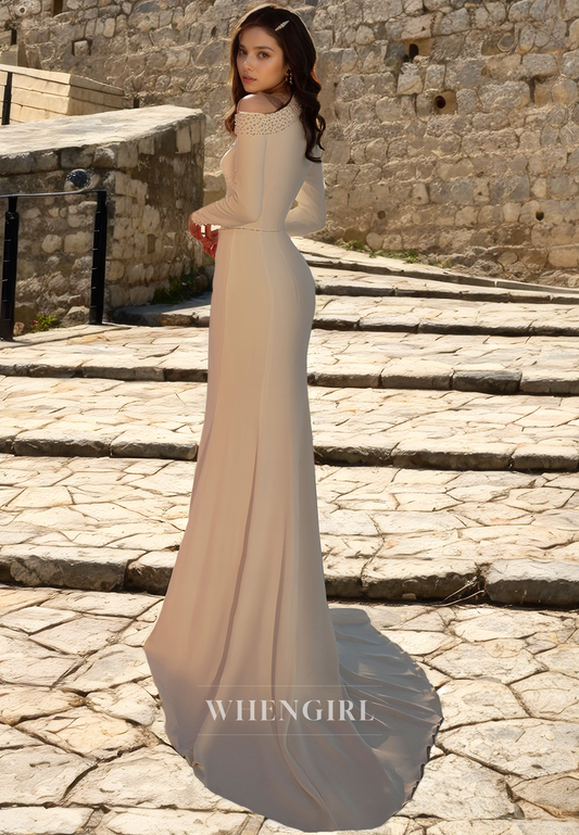 Sheath One Shoulder Long Sleeves Beaded Satin Wedding Dress with Train