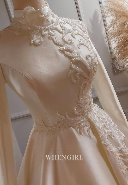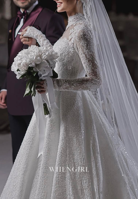 High Neck Long Sleeves Appliqued Lace Beaded A-Line Court Train Wedding Dress