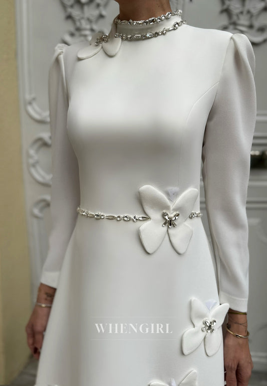 A-Line Long Sleeves High Neck Beading Satin Wedding Dress with Butterfly