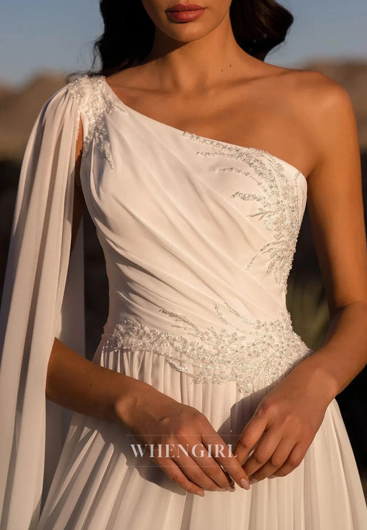 A-Line Side Split Pleated One Shoulder Chiffon Beading Wedding Dress with Train
