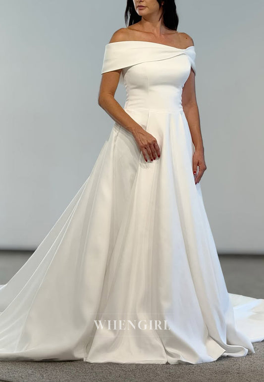 Off Shoulder Simple Sleeveless A-Line Court Train Classic Wedding Dress