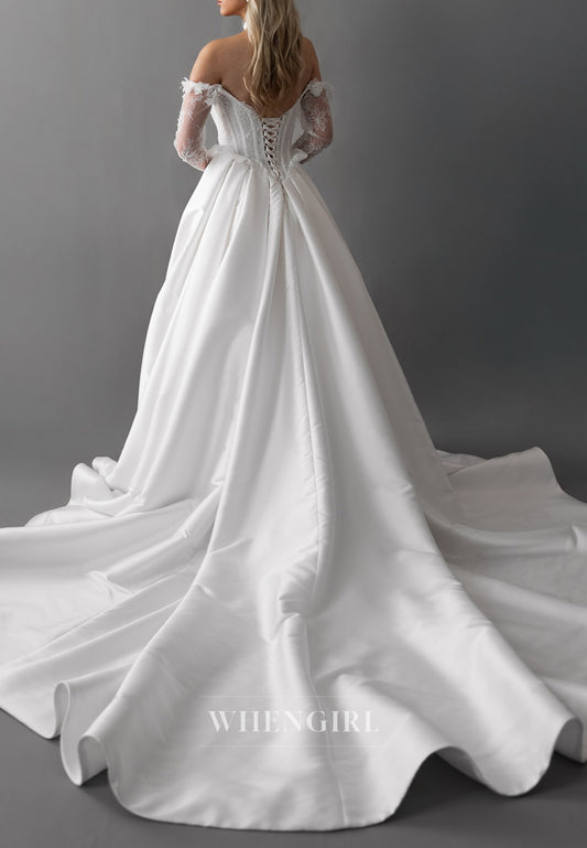 A-Line Off Shoulder Long Lace Sleeves Side Slit Sweep Train Wedding Dress