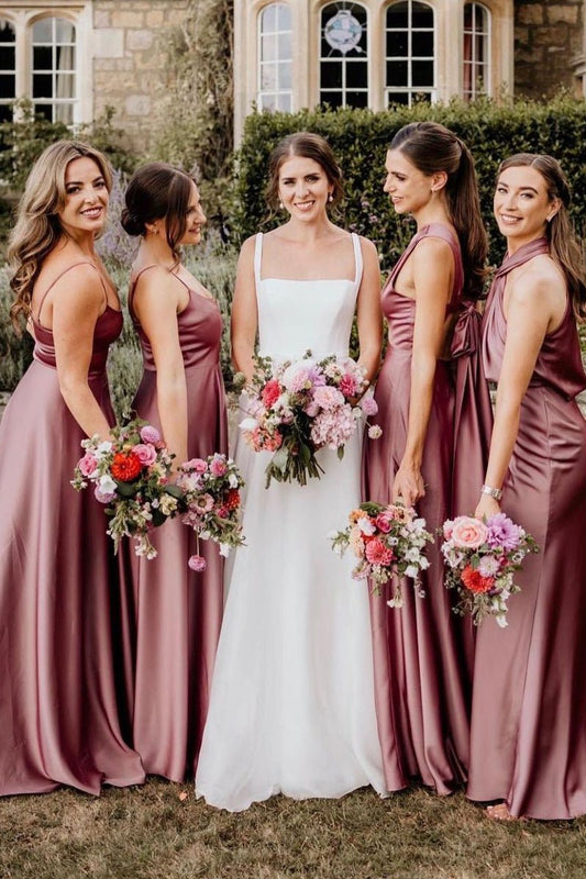 A-Line Square Straps Sleeveless Satin Open Back Wedding Dress with Train