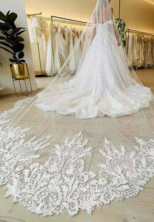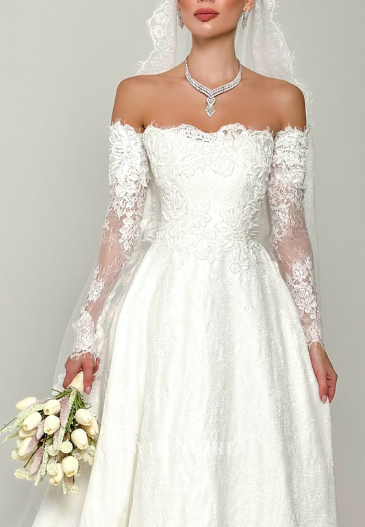 Off Shoulder Long Sleeves Beaded Court Train Appliqued Lace A-Line Wedding Dress
