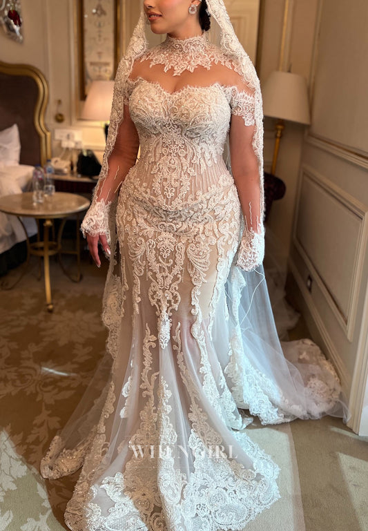 Mermaid High Neck Long Sleeves Beaded Lace Back Zippper Wedding Dress with Court Train