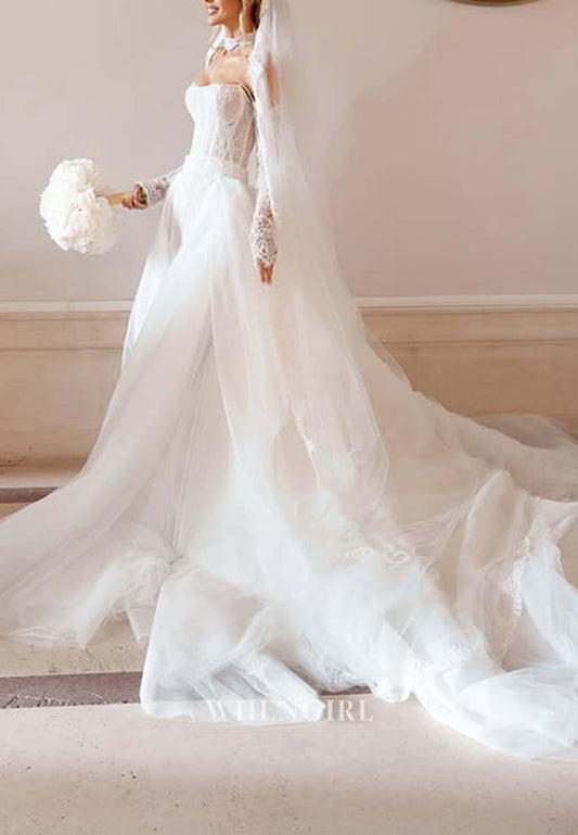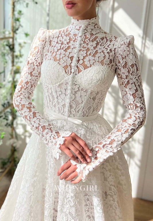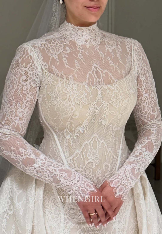 A Line High Neck Lace Long Sleeves Wedding Dresses with Court Train