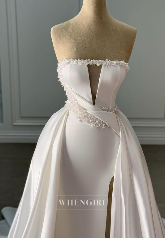 Strapless Pearl Beaded Cut Outs Pleated Sheath Wedding Dress with Side Slit and Court Train