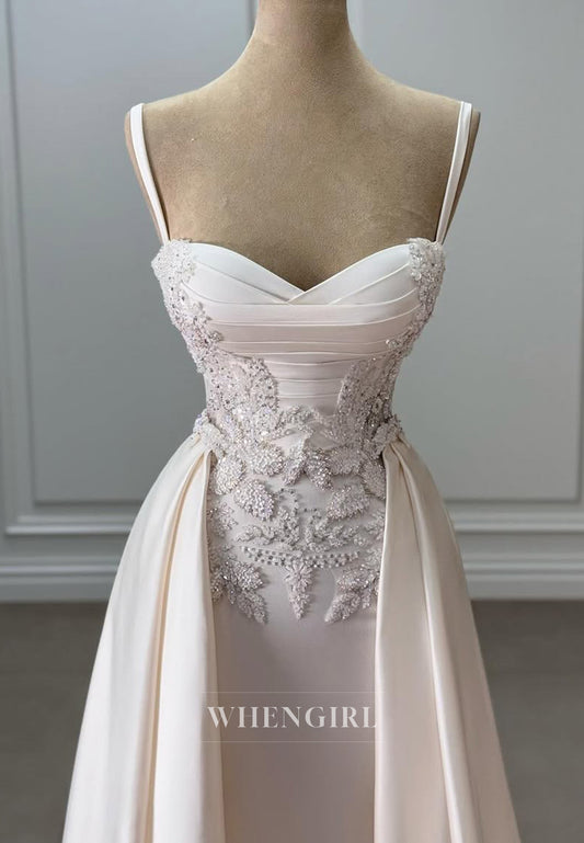 Sheath Sweetheart Sleeveless Pleated Spaghetti Straps Beading Satin Wedding Dress with Court Train