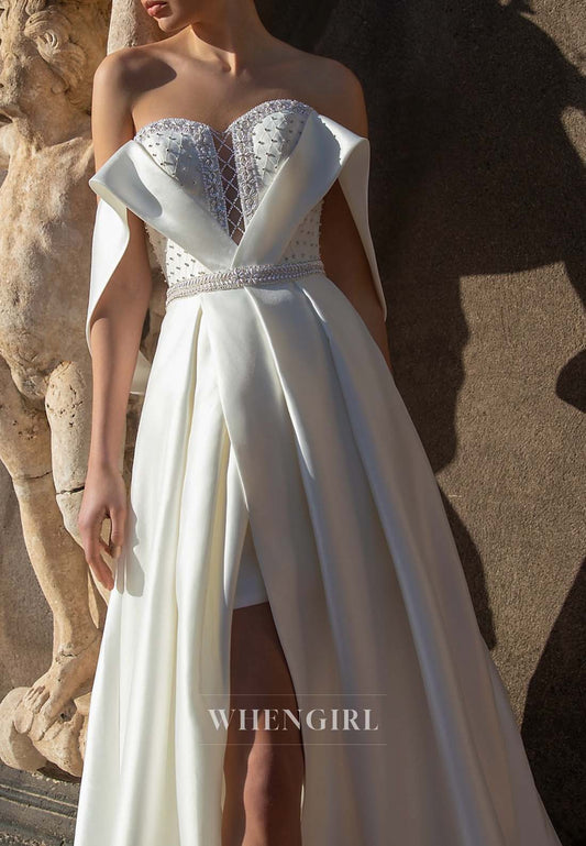 A-Line Off Shoulder Sleeveles Pleated Long Wedding Dress with High Side Slit and Train