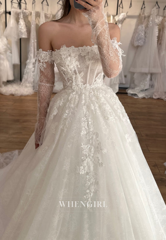 A-Line Court Train Off the Shoulder Tulle Long Sleeve Floral Wedding Dress