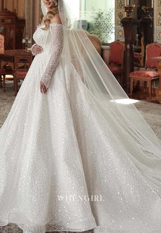 Off Shoulder Beaded Lace Long Sleeves Ball Gown Wedding Dress with Chapel Train
