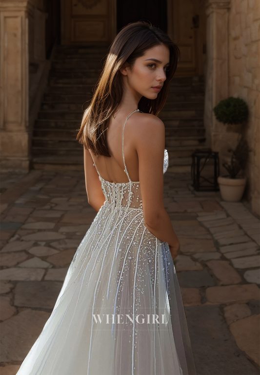 Elegant A-Line Spaghetti Straps Sweetheaert Appliques Beaded Lace Wedding Dress with Train