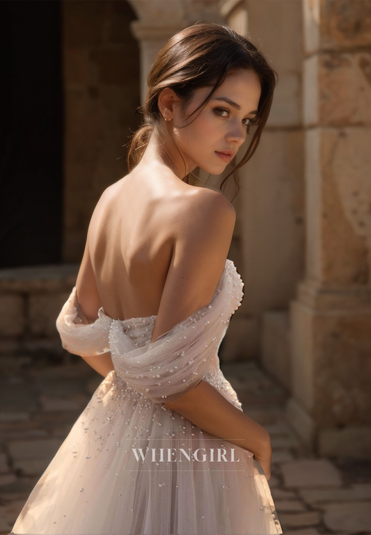 Beaded A-Line Off-Shoulder Sweetheart Sleeveless Pleated Lace Wedding Dress with Train Bridal Gowns