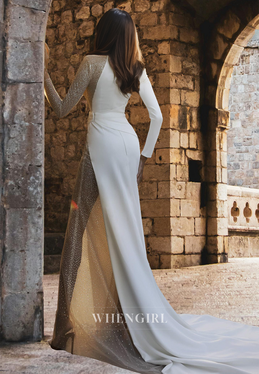 High Neck Long Sleeves Sheath Sweep Train Pleated Long Wedding Dress with Beaded