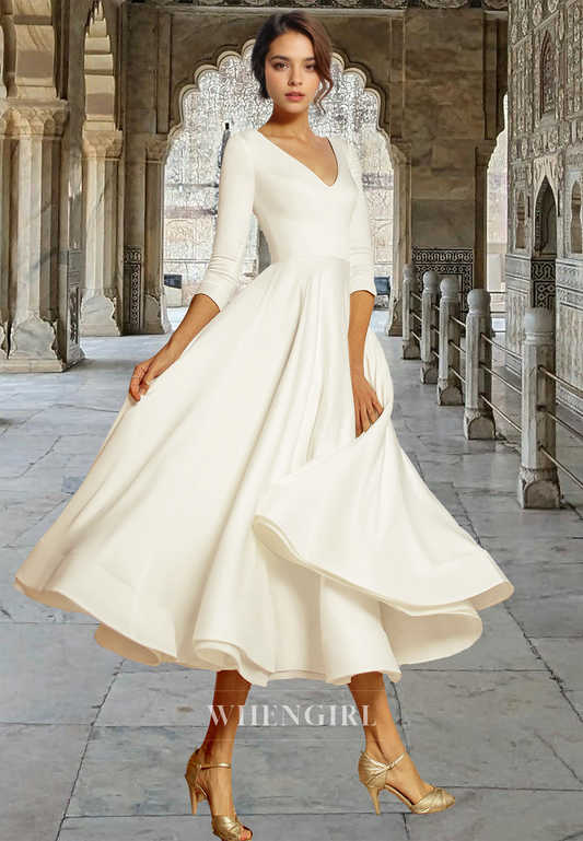 Casual A-Line V-Neck Half Sleeves Satin Pleats Beach Wedding Dress Bridal Gowns