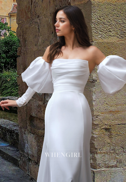 Glamorous Tube Top Long Sleeves Sheath Ruched Satin Wedding Dress with Train Bridal Gown