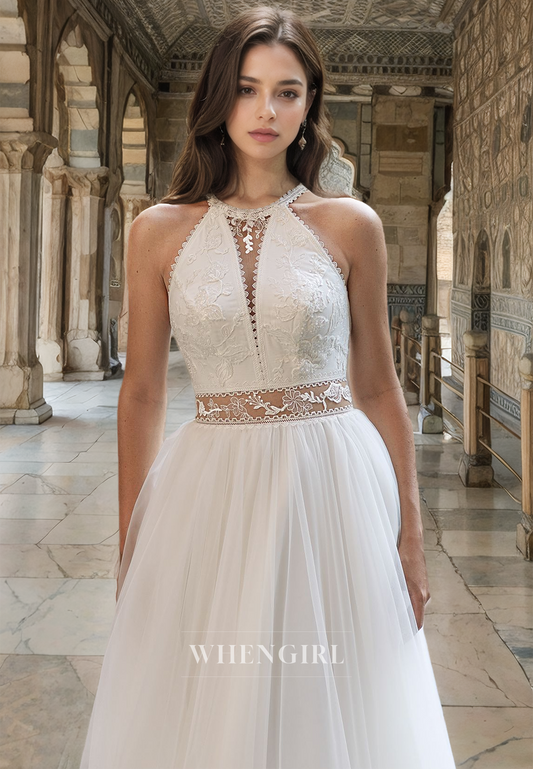 Simple Halter Neck A-Line Sleeveless Pleats Lace Long Wedding Dress Boho Dress with Appliques