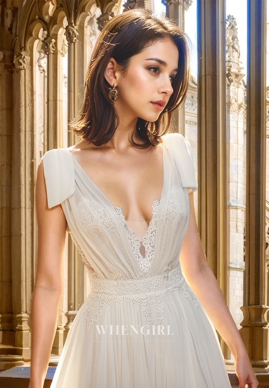 Classic A-Line V-Neck Cap Sleeves Train Applique Lace Bridal Gown with Slit Wedding Dress