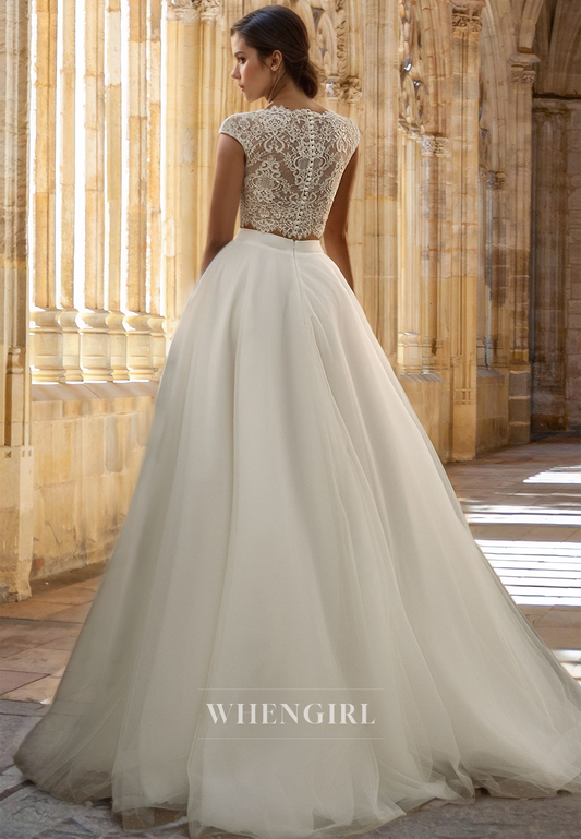 Distinctive A-Line Scoop Neck Cap Sleeves Two Piece Lace Pleats Beach Wedding Dress with Applique