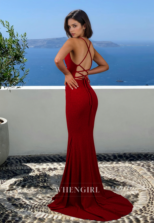 Striking Spaghetti Straps V-Neck Mermaid Sequin Long Party Dress with Train Gala Dresses