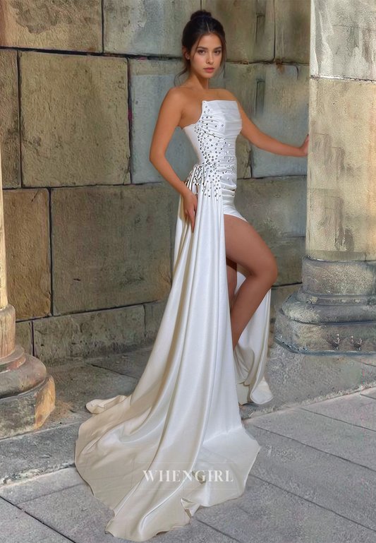 Strapless Sheath Prom Dress Sleeveless High Split Sweep Train Pleats Satin Formal Gowns with Beads
