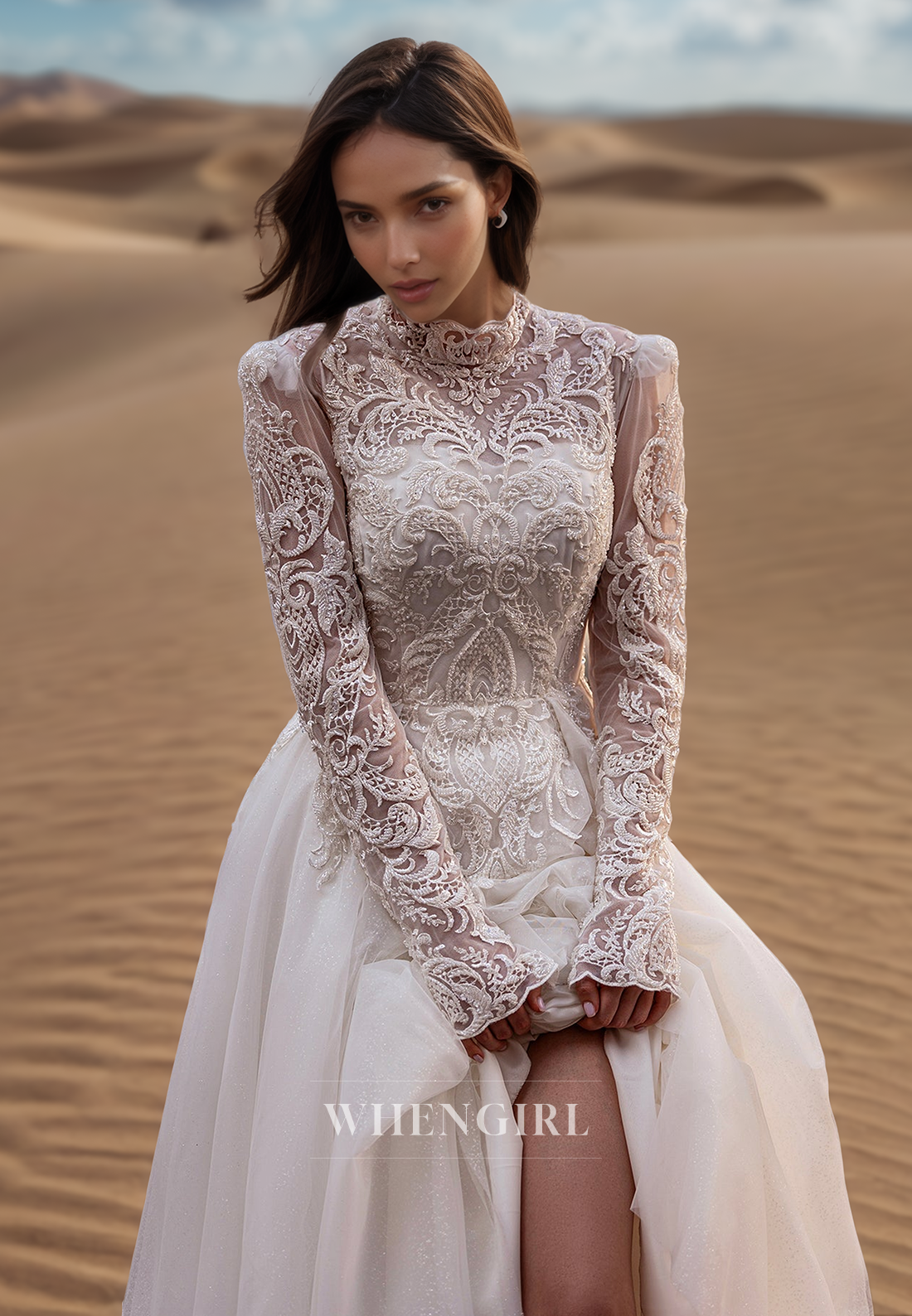 This luxurious wedding dress features long sleeves and a high neck, creating an elegant and sophisticated look. The A-line silhouette and pleats flatter any body type, while the delicate lace and intricate appliques add a touch of romance. Perfect for the modern bride seeking a timeless and stunning gown.