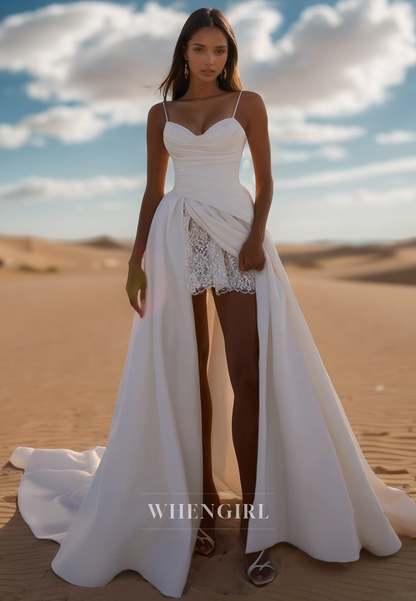 Elegant Sweetheart Spaghetti Straps Appliques Satin A-Line Wedding Gowns with Train