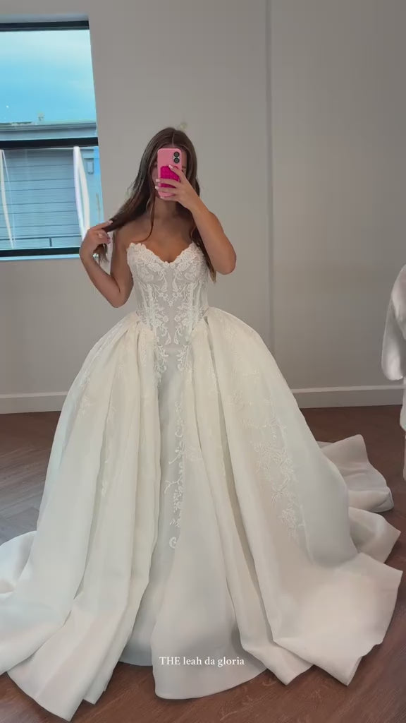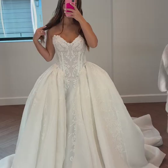 This ball gown wedding dress features a sweetheart neckline and sleeveless design, intricately detailed with beaded appliqued lace for a luxurious and romantic look. The full skirt creates a dramatic silhouette, while the court train adds an elegant, flowing finish. Expertly crafted, this gown combines timeless sophistication with exquisite detailing, perfect for a bride seeking classic grandeur.