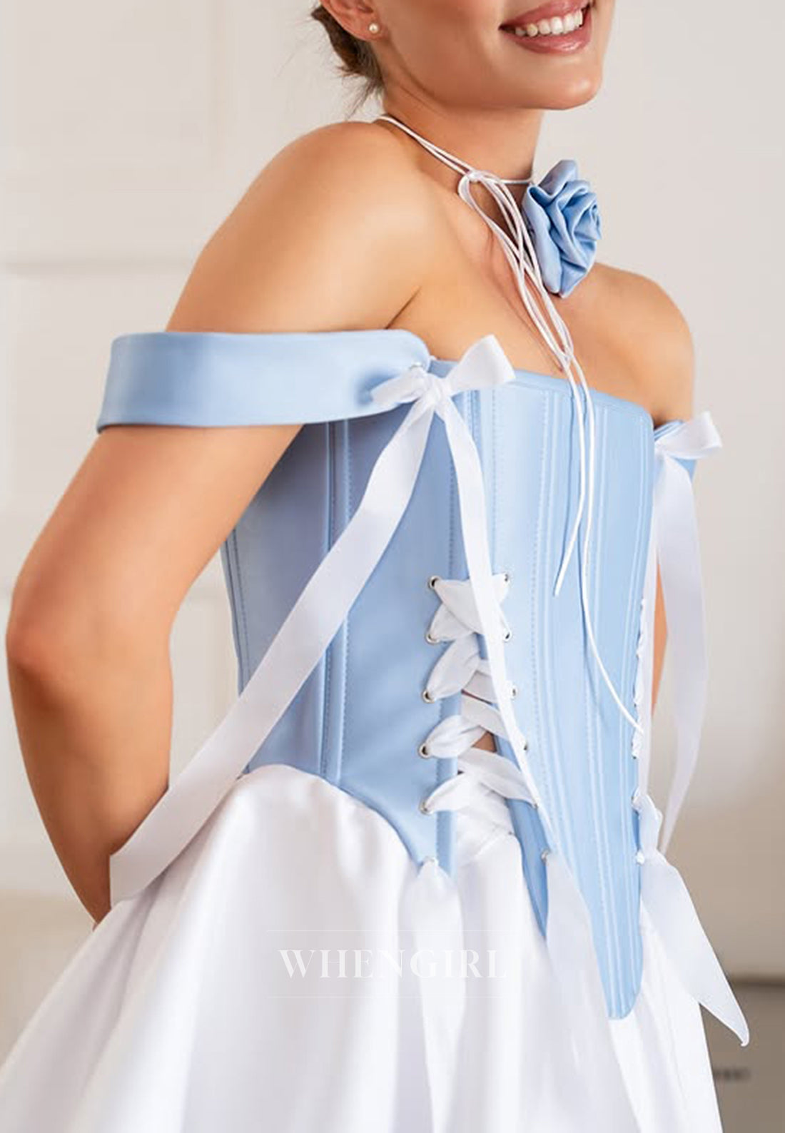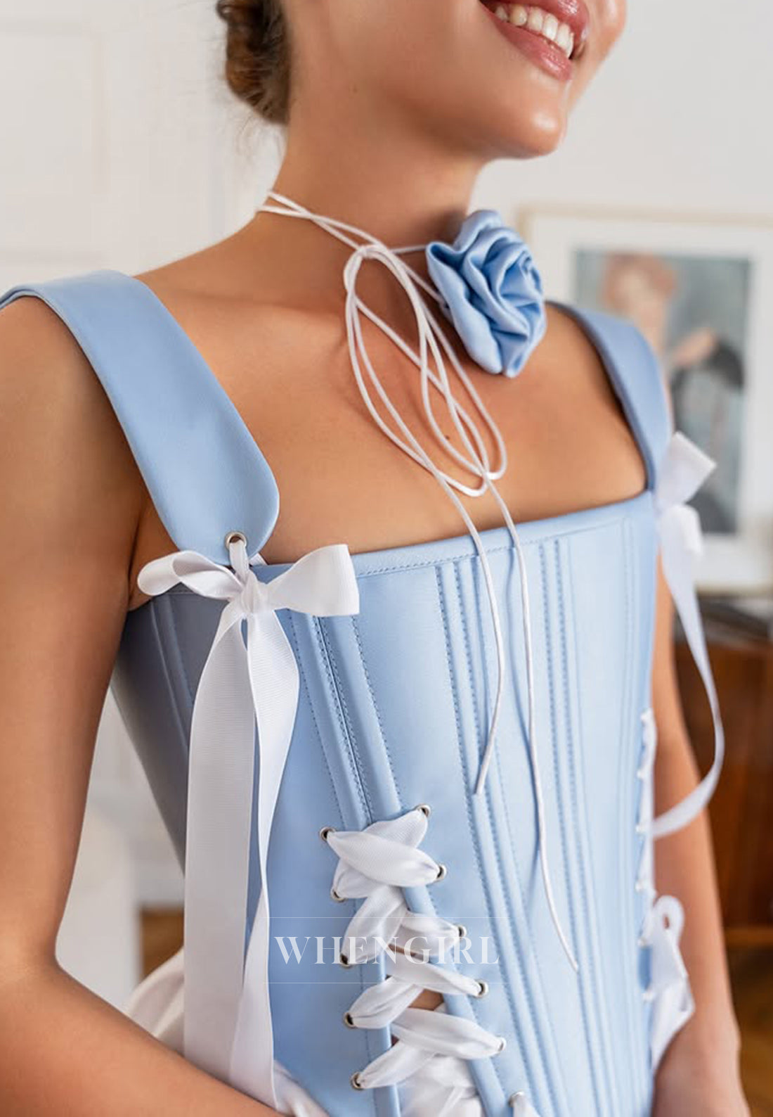 Blue and White Square Neck Bowknot Sleeveless A-Line Homecoming Dress x 1;