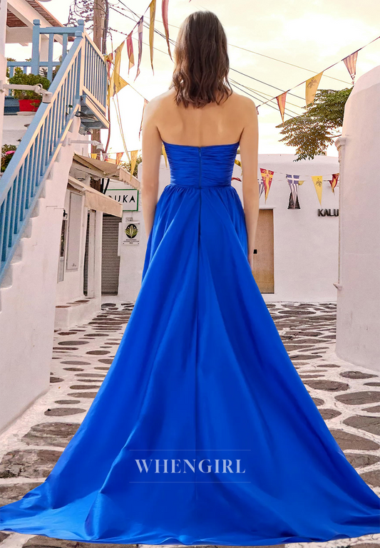Elegant Sweetheart A-Line Sleeveless Side Slit Satin Pleated Evening Party Dress with Train