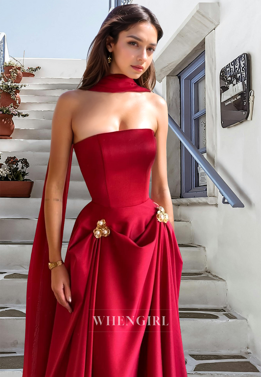 Glamorous A-Line Tube Top Beaded Pleated Satin Prom Dress with Pockets Party Gown