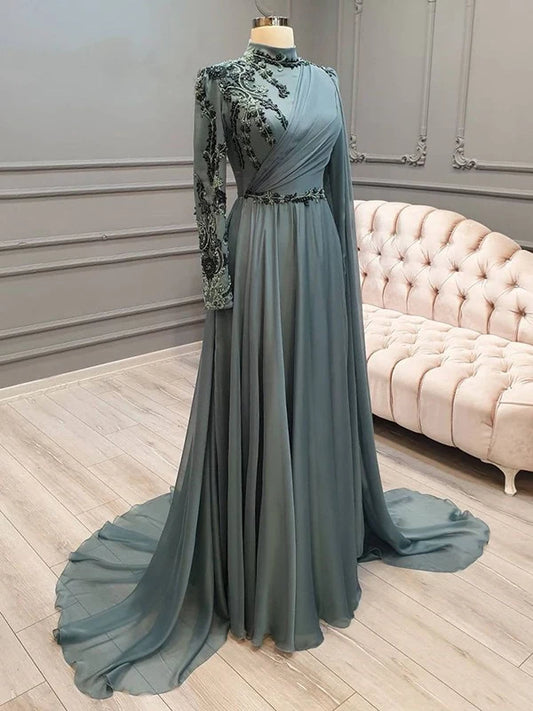 Chiffon Appliques Full Sleeve Muslim Prom Evening Dresses with Cape Arabic Dubai Hijab Formal Party Gowns