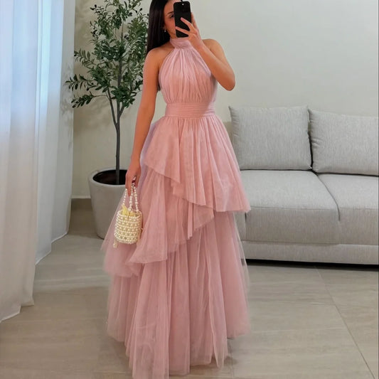 Customized Multi-Layered A-line Mesh Fabric robes de soirée Halter Neck Sleeveless Party Dresses Ankle-Length Prom Dress