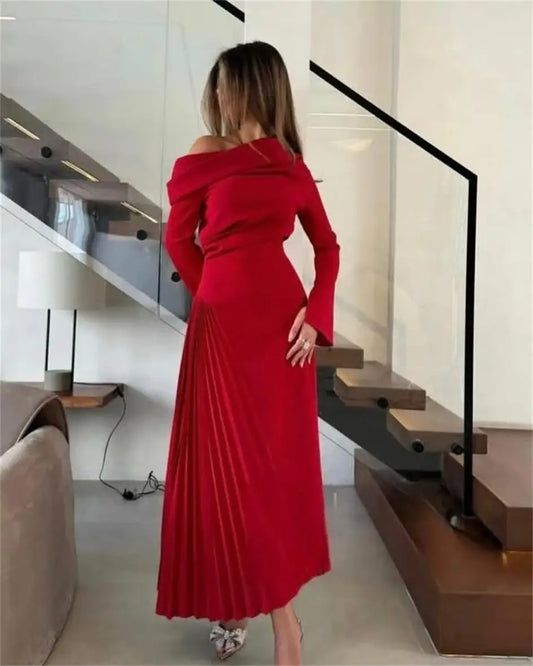 Customized Long Sleeves Prom Dresses One Shoulder Pleated Ankle Length Formal Occasion Dress Temperament Evening Dresses