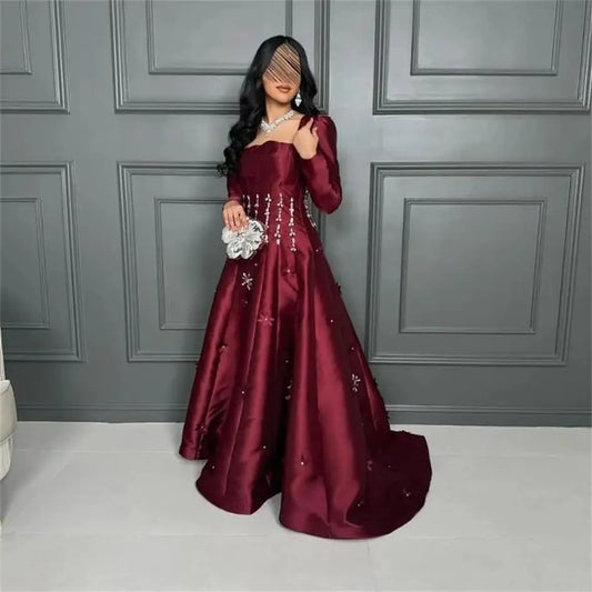 Customized Long Sleeves Prom Dresses Square Neck Crysatls Flowers Floor Length Temperament Evening Dresses Party Dresses