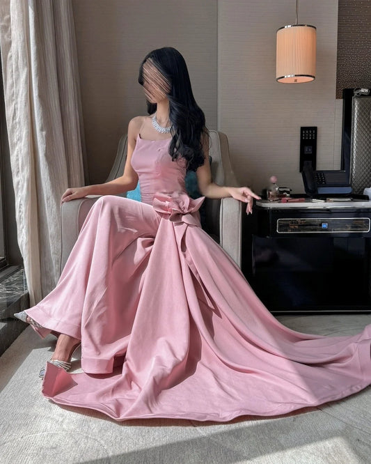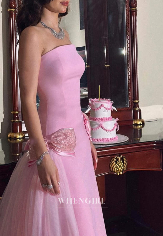 Candy Pink Sheath Strapless Off Shoulder Sweet Court Train Evening Formal Dress with Bowknot