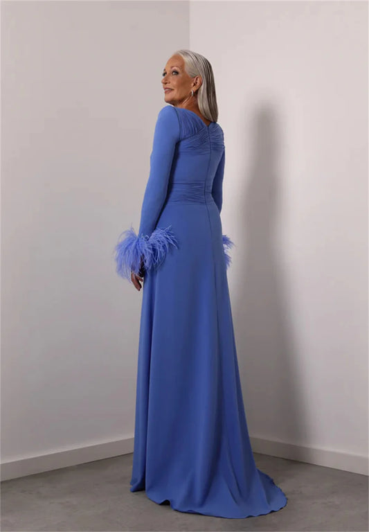 Elegant Blue Feathered Long Sleeves Mother Of The Bride Dress Floor-length Formal Evening
