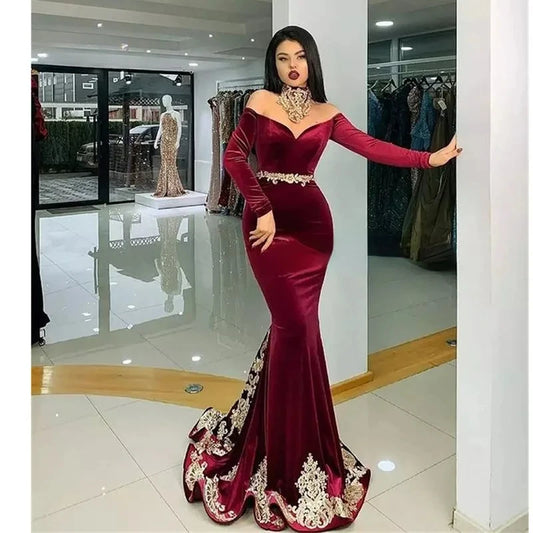 Red Wine Moroccan Kaftan Long Evening Dress Sexy Mermaid Dubai Formal Gowns Charming Gold Appliques Celebrity Dresses Plus Size