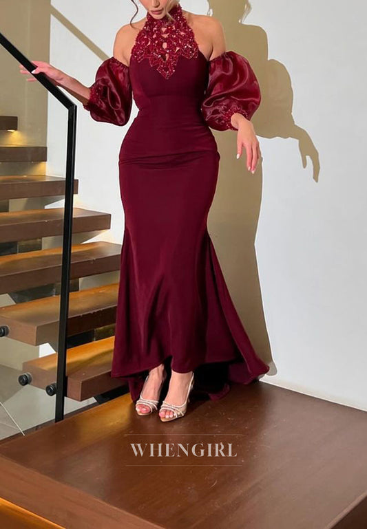 Chic High Neck Half Sleeves Appliques Mermaid Long Formal Evening Dress