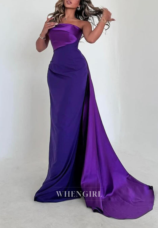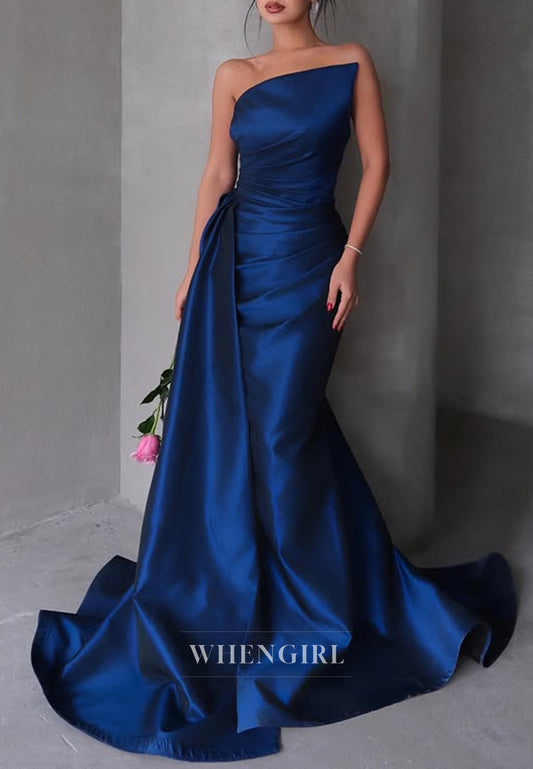 Strapless Satin Pleats Mermaid Long Formal Evening Dress with Train