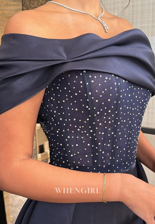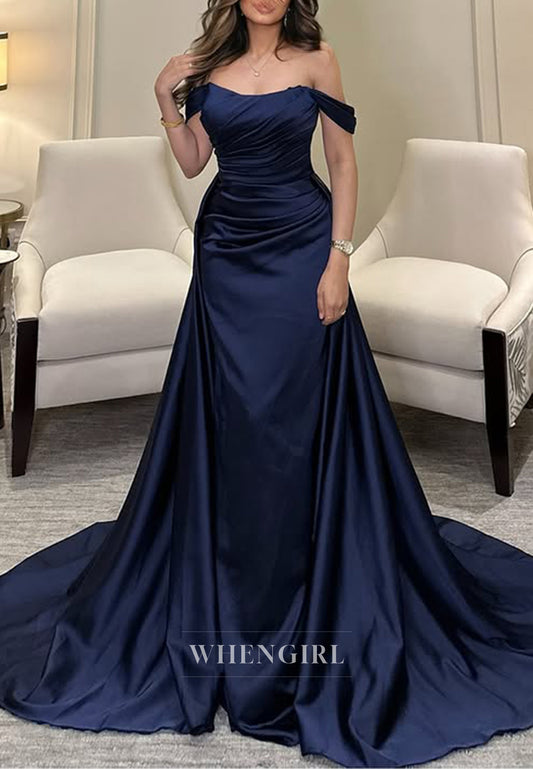 Pleated Off Shoulder Beaded Sweetheart Satin Evening Dresses With Sweeping Side Drape