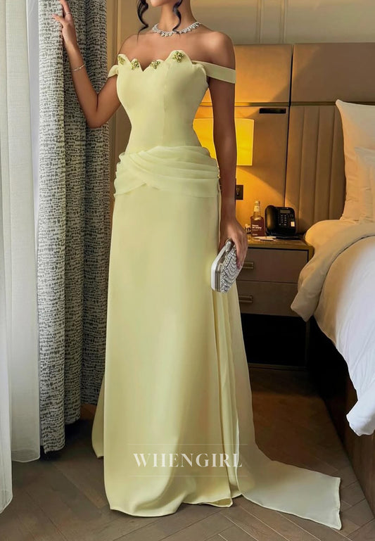 Yellow Off Shoulder Flower Sheath Sleeveless Formal Evening Dress with Train