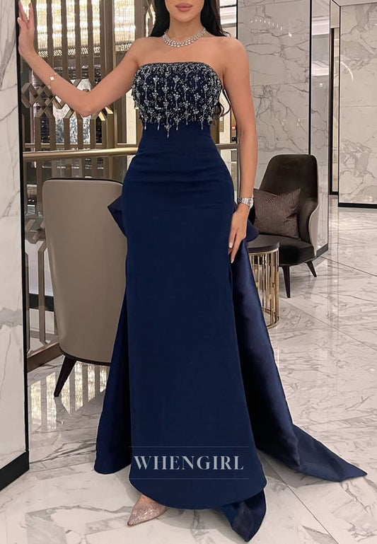 Navy Sleeveles Sheath Satin Train Strapless Evening Formal Dress with Rhinestone
