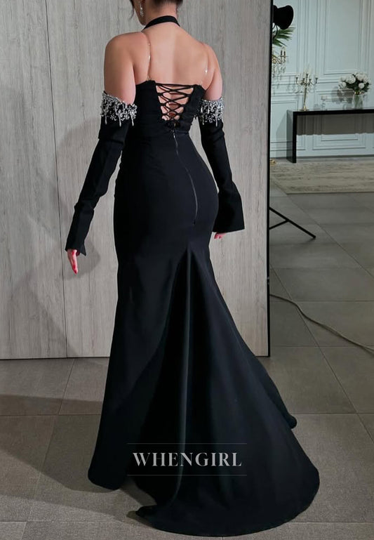Black Beaded Long Sleeves Tie Back Mermaid Formal Evening Dress
