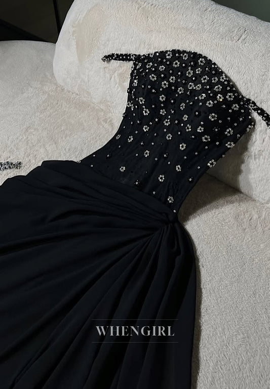 Black Spaghetti Straps Beaded Flowers A-Line Long Formal Evening Dress