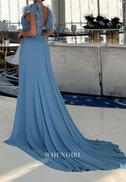 Sheath V Neck Chiffon Pleats Feathers Long Formal Evening Dress with Slit