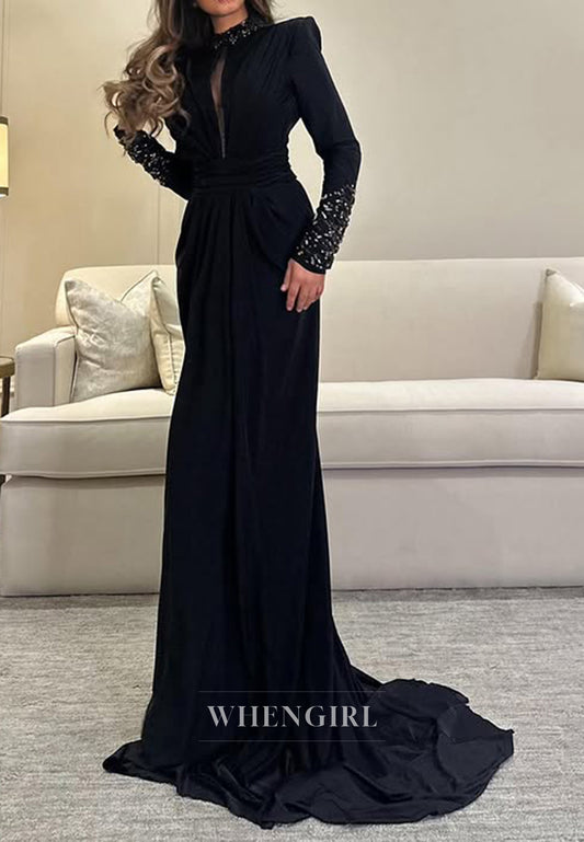 Chic High Neck Black Chiffon Beads Long Sleeves Formal Evening Dress with Slit