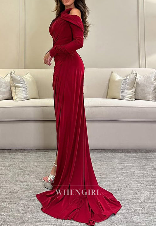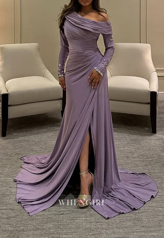 Asymmetrical Neck Ruched Long Sleeves Mermaid Formal Evening Dress with Slit