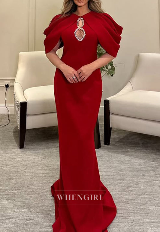 Elegant Scoop Neck Short Sleeves Elastic Satin Evening Dresses With Rhinestone